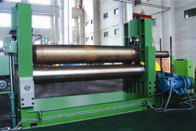 本機機構(gòu)形式為三輥對稱式,上輥在兩下輥中央對稱位置坐垂直升降運動,通過液壓缸內(nèi)的液壓油作用于活塞而獲得,為液壓傳動,兩下輥作旋轉(zhuǎn)運動,通過減速機的輸出齒輪與下輥齒嚙合,為卷制板材提供扭矩。本機結(jié)構(gòu)緊湊,操作維修方便。